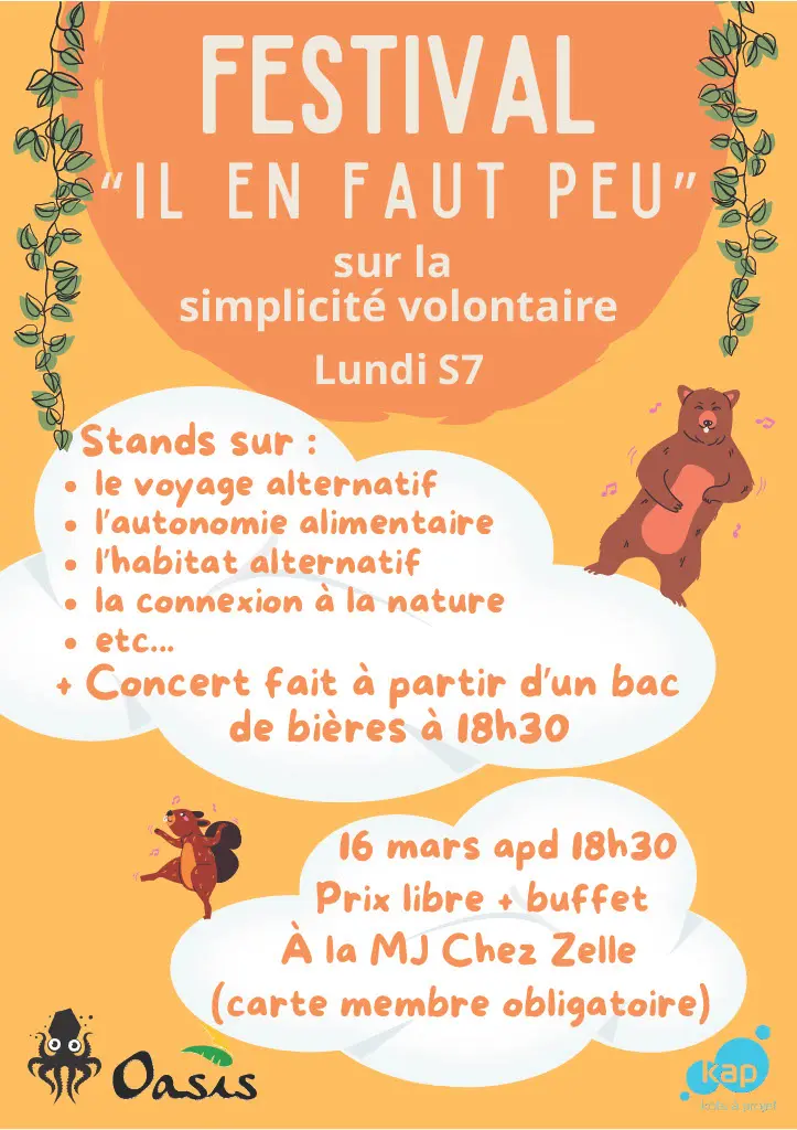 Le Kot Oasis te propose une soirée de (re)découverte de la simplicité volontaire à travers des stands tenus par différent.es intervenant.es appliquant ce mode de vie dans des domaines tels que le voyage alternatif, la reconnexion à la nature, l’autonomie alimentaire et bien d’autres ! La soirée débutera avec un petit concert de Max Vandervorst qui nous montrera comment faire de la musique à partir d’objets recyclés.