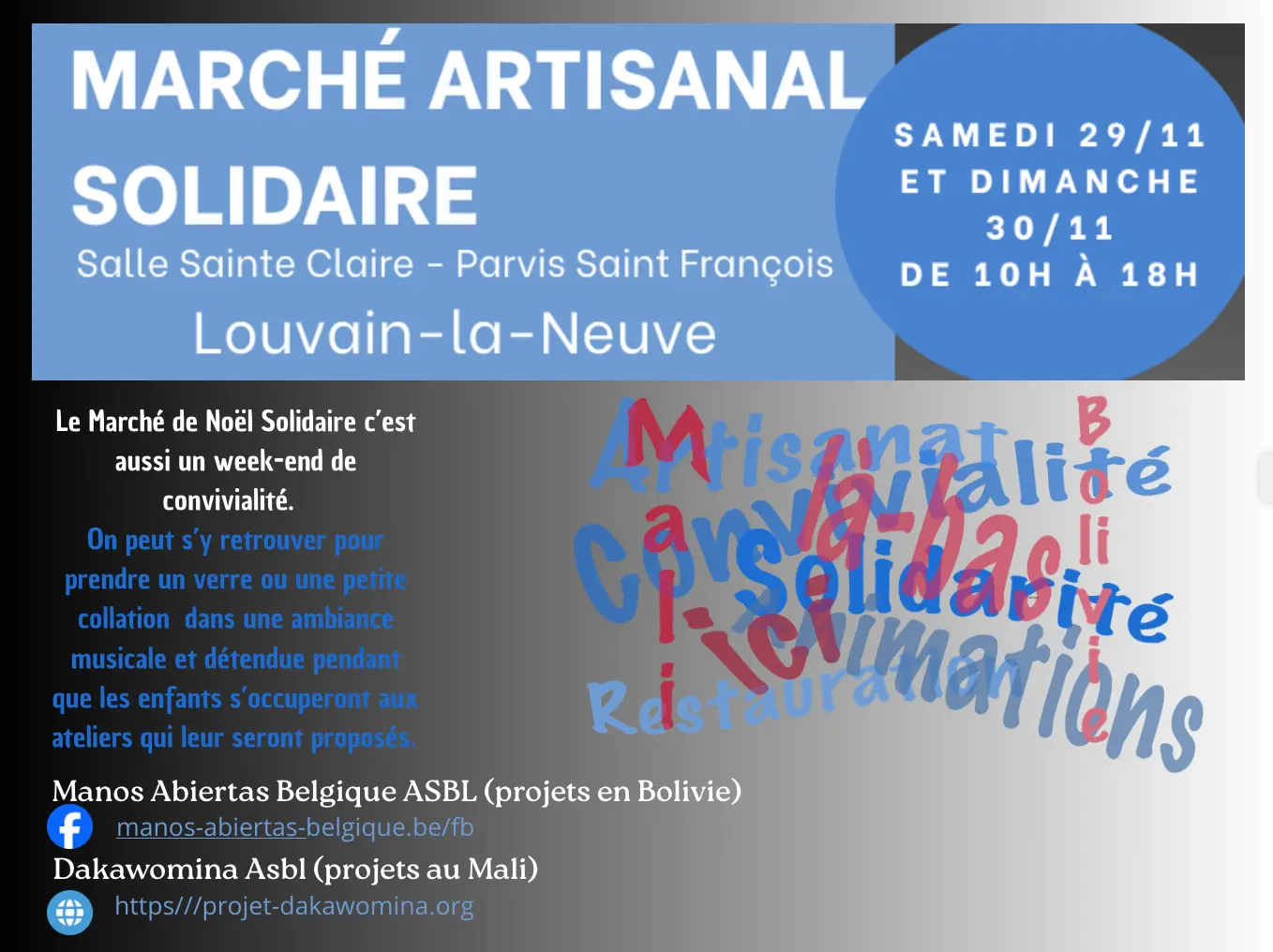 Depuis six ans, le Marché de Noël Solidaire, organisé par Dakawomina ASBL en partenariat avec Manos Abiertas Belgique ASBL, rassemble des associations et artisans qui présentent leurs projets et vendent des produits éthiques issus de pays du Sud.