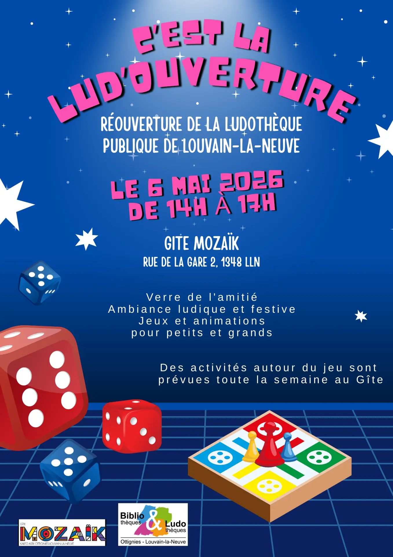 Venez fêter avec nous la réouverture de la Ludothèque publique de Louvain-la-Neuve au Gîte Mozaïk dans une ambiance ludique et festive !